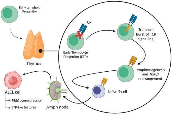 The most widely accepted theory about the etiopathogenesis of ALCL is that it is initiated in early thymocytes, before TCR-β rearrangement, and requires an initial transient burst of TCR signaling to initiate lymphomagenesis. This hypothesis is supported by the fact that some ALCL cells overexpress TARC (Thymus and Activation-Regulated Chemokine) or acquire thymic progenitor-like features [61,62,63].
