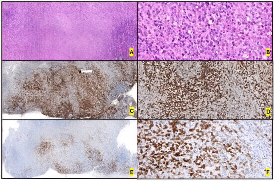 Neoplastic small-to-medium-sized cells with homogeneous appearance are partially disrupting lymph node architecture ((A), HE, 10× and (B), HE, 40×). Neoplastic cells express CD30 ((C), 10× and (D), 20×) and ALK with a peculiar exclusive cytoplasmic pattern ((E), 10× and (F), 40×).