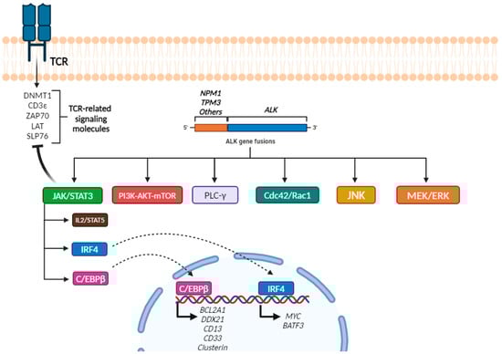 Constitutively activated ALK fusion proteins promote tumorigenesis by activating diverse signal transduction pathways, including the PLC-γ [95], PI3K/AKT/mTOR [96,97], Cdc42/Rac1 [98], JNK [99], MEK/ERK, JAK/STAT3 [100,101] and STAT5 [102] pathways. Their activation promotes oncogenesis by enhancing cell survival, inhibiting apoptosis, promoting tumor dissemination and immune surveillance evasion mechanisms [101]. Furthermore, NPM1::ALK has been reported to control T-cell identity by epigenetic silencing of many T-cell-associated antigens (TCR-related signaling molecules) [83,103], such as DNMT1, CD3ε, ZAP70, LAT and SLP76, through STAT3-mediated regulation of gene transcription and/or epigenetic silencing [103], However, 74–90% of sALCL cases (ALK+ and ALK- ALCLs) feature clonal TCR rearrangements [79].