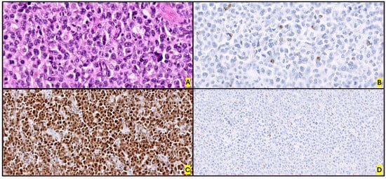 Fewer than 20% of cases express TCR (mainly αβ), and occasional cases lack immunophenotypic evidence of T-cell lineage (“null-cell”) [160,161,162]. Some rare cases with TCR-γδ expression have been reported [163]. CD4 may be expressed in 70% of cases, while CD8 is expressed in only 14% of them [164]. They are positive for CD43, CD2, CD3, CD5 and CD7 (the latter four markers with a frequency of 50%), and cytotoxic markers (TIA1, granzyme B, perforin). They are less commonly positive than the ALK+ subgroup for EMA and Clusterin. CK is usually negative, which contrasts with ALK+ ALCL cases. Immune evasion markers, such as PD-L1, TGF-beta and IL-10, are also frequently expressed. Nuclear pSTAT3 is expressed in 50% of cases. Finally, these cases are negative for Epstein–Barr virus (EBV) infection [165,166]. Rare cases with PAX5 expression (similar to CHL cases) have been reported [167,168,169]. Some of them coexpress PAX5 and CD138 without T-cell markers [170].