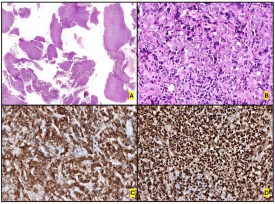 Morphology cannot reliably distinguish ALK+ and ALK- ALCL due to their similarities, in addition to the absence of ALK expression or ALK rearrangements [11,12,15]. IHC and molecular techniques are essential for establishing a definitive diagnosis in these cases. Observation of mitoses and necrosis is also relevant. Involvement may be focal or intrasinusoidal. The most important diagnostic criterion is the complete or partial infiltration of lymph node or extranodal tissue by “hallmark cells”. Transdifferentiation to malignant histiocytosis has been described on rare occasions [159]. Morphological differences between genetic subtypes will be addressed in the following sections. However, certain features suggest that a case might be ALK−, including the presence of plasmablastic cells and a starry-sky pattern [65] (Figure 5).