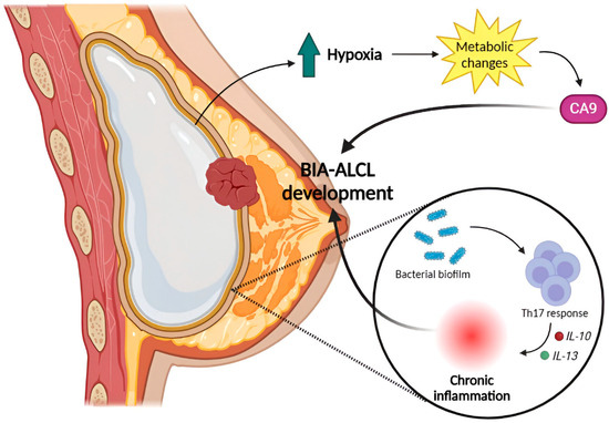 - DeCoster, R.C.; Clemens, M.W.; Di Napoli, A.; Lynch, E.B.; Bonaroti, A.R.; Rinker, B.D.; Butterfield, T.A.; Vasconez, H.C. Cellular and Molecular Mechanisms of Breast Implant-Associated Anaplastic Large Cell Lymphoma. Plast. Reconstr. Surg. 2021, 147, 30e–41e. [Google Scholar] [CrossRef]