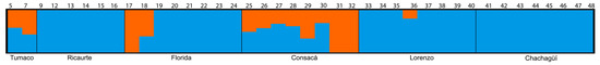 Analysis of the ADMIXTURE population structure of the species evaluated revealed similar patterns to the genetic diversity analyses (Figure 1), showing that a two-cluster model (K = 2) was the most likely structure for the dataset. The Tumaco, Consacá, and San Lorenzo populations showed a combination of both colors, indicating the presence of more than one genetic group within them. In contrast, Ricaurte, La Florida, and Chachagüí populations were predominantly blue, indicating greater genetic homogeneity within these populations.