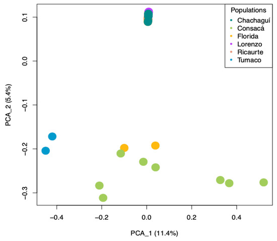 Figure 2. Principal component analysis (PCA) plot showing genetic relationships among the six natural populations of G. angustifolia. The dots represent the populations of origin: blue for Tumaco, green for Consacá, yellow for La Florida, red for Ricaurte, purple for San Lorenzo, and aquamarine for Chachagüí.