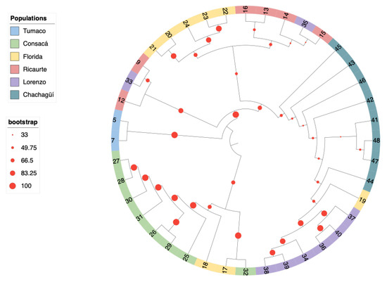 Figure 4. Phylogenetic tree based on the natural G. angustifolia population phylogenetic tree inferred by maximum likelihood from the analysis of 40 individuals. The branches are colored according to the population of origin: blue for Tumaco, green for Consacá, yellow for La Florida, red for Ricaurte, purple for San Lorenzo, and aquamarine for Chachagüí.