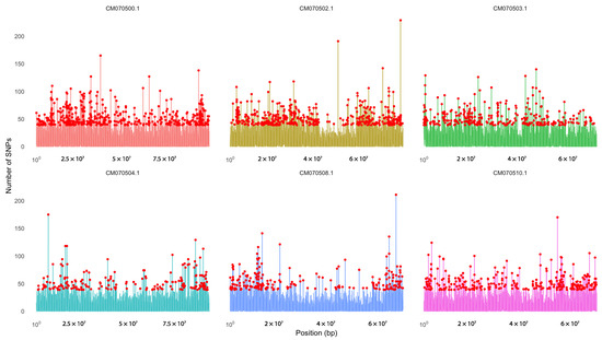SNP hotspot analysis was performed on the RAD-seq data obtained for Guadua angustifolia, which allowed the identification of genomic regions with a high density of variants. Figure 5 shows the six chromosomes that had the highest number of SNPs, specifically CM070500.1, CM070502.1, CM070503.1, CM070504.1, CM070508.1, and CM070508.1, which stand out as potential regions of high genetic variability. Figure S1 shows the total distribution of SNPs along all chromosomes of the reference genome (GCA_036346375.1), which revealed heterogeneity in the distribution of these variants.