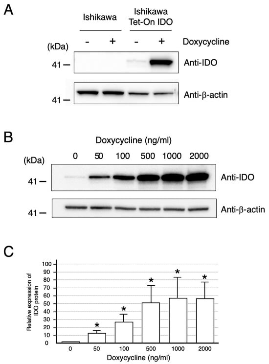 The protein expression level of indoleamine 2,3-dioxygenase (IDO) in Ishikawa cells. (A) IDO protein levels in Ishikawa cells and Ishikawa cells stably transfected with a plasmid encoding IDO under the control of a tetracycline inducible promoter (Ishikawa Tet-On IDO cell) treated with 200 ng/mL of doxycycline or vehicle (Nil) for 12 h were analyzed by Western blotting as described in Section 4. The presented results are from a single representative experiment. (B) The effect of doxycycline concentration on the stimulation of IDO protein expression level. Ishikawa cells were cultured for 22 h with the indicated concentrations of doxycycline. IDO protein levels were analyzed by Western blotting as described in Section 4. The presented results are from a single representative experiment. (C) The relative quantitation of IDO protein level. The intensity of either the IDO or the β-actin band was quantitated by using a gel documentation and analysis system and the ratio of the two was used as a normalized relative abundance value of IDO protein. Data represent the mean ± S.D. of three separate experiments. * Significantly different from values cultured without doxycycline (p < 0.05).