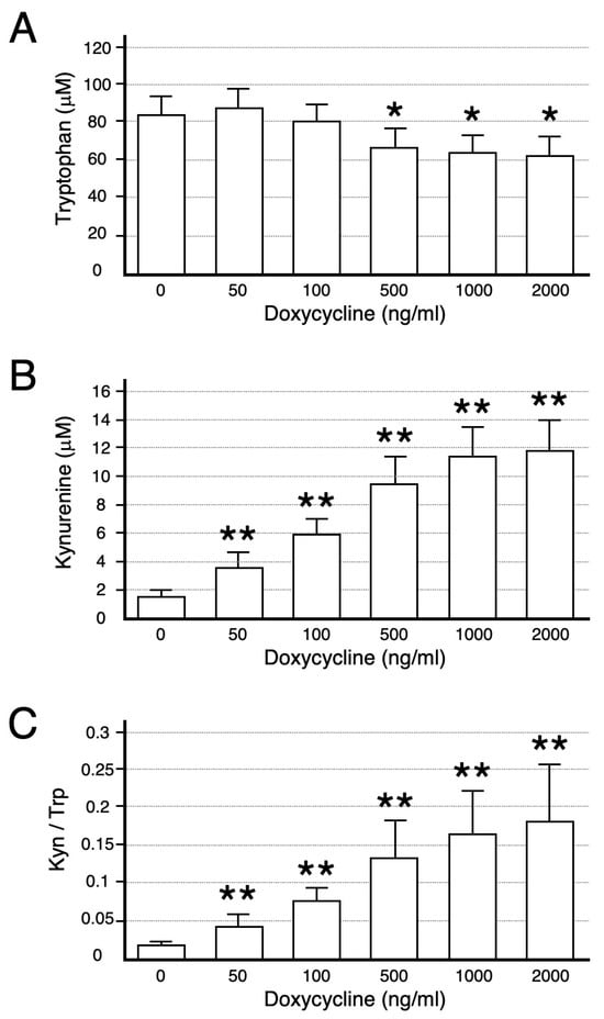 Tryptophan and kynurenine concentrations and the ratio of kynurenine to tryptophan. Concentrations of tryptophan (A) and kynurenine (B) in the conditioned medium were analyzed as described in Section 4. (C) The ratios of kynurenine (Kyn) to tryptophan (Trp). Values are the mean ± S.D. of three separate experiments with a duplicate assay and are significantly different from values cultured without doxycycline (* p < 0.05, ** p < 0.01).