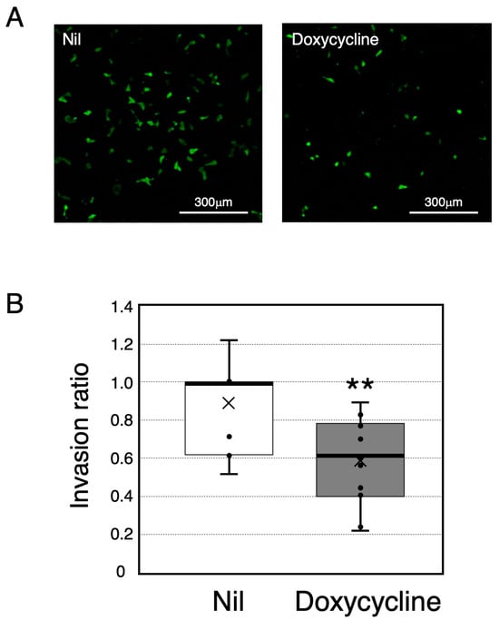 An analysis of HTR-8 cell invasion. HTR-8/SVneo cells stably expressing GFP (HTR8 GFP cell) were cultured on a layer of Ishikawa cells stably transfected with a plasmid encoding IDO under the control of a tetracycline inducible promoter (Ishikawa Tet-On IDO cell) with 200 ng/mL of doxycycline or vehicle (Nil). Then, the number of HTR8 GFP cells which appeared on the opposite side of the permeable membrane was assessed. (A) HTR8 GFP cells imaged by fluorescence microscopy. Images were collected by fluorescence microscopy as described in Section 4. Scale bar, 300 µm. (B) The number of invaded cells. Data represent box and whisker plots of six separate experiments, expressed as the invasion ratio (i.e., values with vehicle set to 1). ** Significantly different from values cultured without doxycycline (p < 0.01).