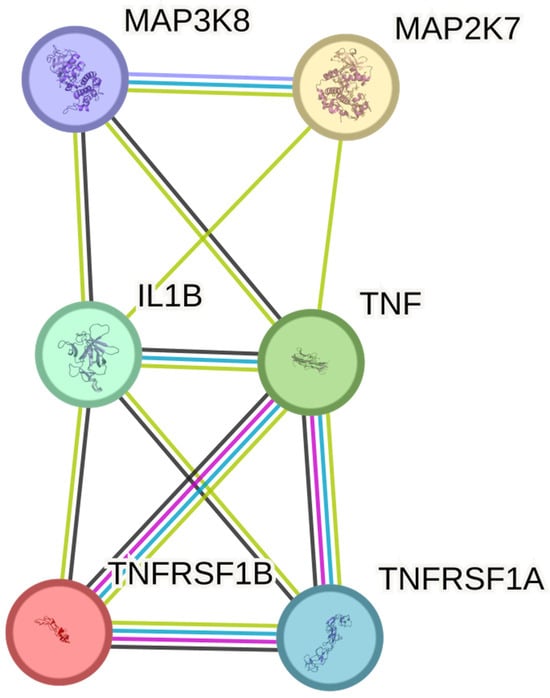 2.6. Functional Network Analysis of Selected Proteins: Insights from Protein–Protein Interaction (PPI) Analysis