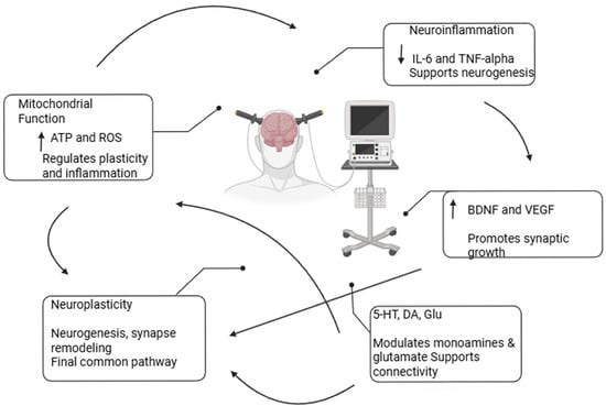 Finally, the cytokine hypothesis explains that the mechanisms of ECT are related to alterations in cytokine levels after ECT sessions, specifically the levels of interleukin (IL)-6 and tumor necrosis factor-α (TNF-α), while these markers significantly decrease after ECT [77]. This model complements the neuroendocrine hypothesis, as both involve systemic responses outside the central nervous system, and it aligns with the neuroplasticity theory by implicating inflammation in neurodegeneration and plasticity.