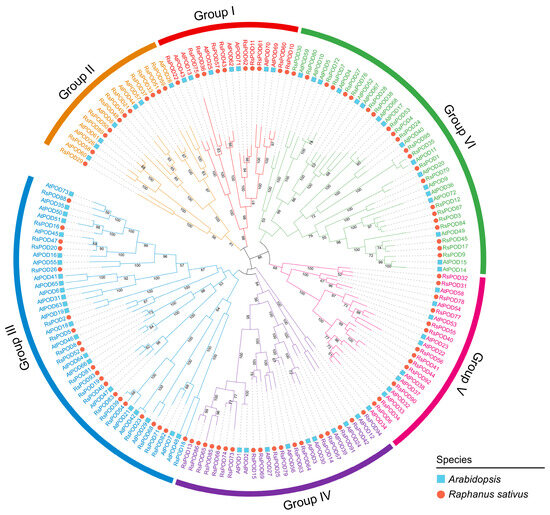 Phylogenetic analysis of POD proteins in R. sativus and A. thaliana. The PODs were divided into six subgroups (group I, II, III, IV, V, and VI). The blue squares and red circles represent the POD proteins in A. thaliana and R. sativus, respectively.