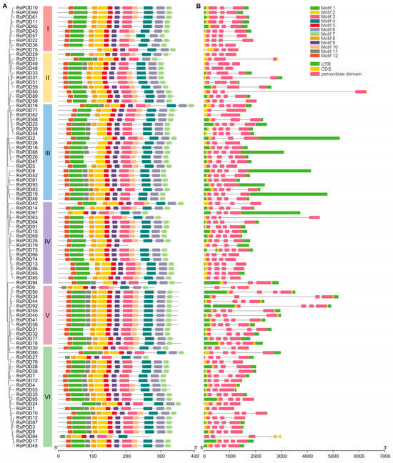 Conserved motifs and exon–intron structure analysis of the RsPODs. (A) The phylogenetic tree shows that the RsPODs are distributed in six groups (I–VI), which are indicated by red, yellow, blue, purple, pink, and green, respectively. Boxes with different colors represent different motifs. (B) The exon–intron structures of the RsPODs. The green, yellow, and pink boxes represent the UTR, CDS, and peroxidase domain, respectively. The size of the RsPOD members is indicated by the scales at the bottom.