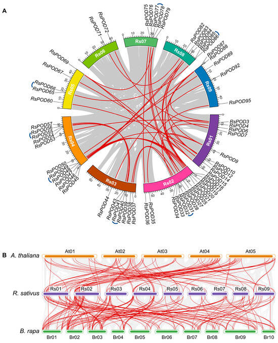 Collinearity analysis of the RsPODs. (A) Intraspecific collinearity analysis of the RsPODs in the radish. Different chromosomes are shown in different colors. Approximate positions of the RsPODs are marked with black lines on the chromosomes. Red and blue curves indicate segmental and tandem duplication events of the RsPODs, respectively. (B) Interspecific collinearity analysis of PODs in A. thaliana, R. sativus, and B. rapa. Red curves indicate the gene pairs of PODs in three species.