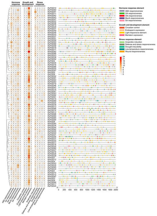 cis-element analysis in the promoter region of the RsPODs. The cis-elements were grouped according to their functional implications. The left heatmap shows the number of elements in each promoter. The distribution of these elements in the promoter region is shown on the right. Different elements are represented with different colored boxes.