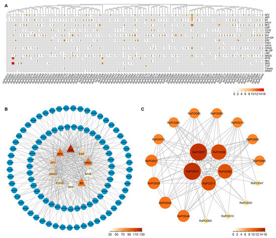 Regulatory network of the RsPODs. (A) Heatmap showing the number of TF binding sites in promoter regions of the RsPODs. (B) The top 10 highly enriched TFs and their targeted RsPODs. Triangle and circle nodes represent TFs and their targeted RsPODs, respectively. The node color represents the number of TFs. (C) Functional interaction networks of the RsPOD proteins. The node color represents the number of proteins.