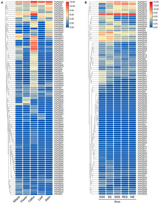 To explore the potential biological functions of the RsPODs in the radish, their expression patterns in five different tissues and five representative developmental stages of roots were analyzed using RNA-seq data from the previous studies [32,39]. A heatmap was constructed based on the fragments per kilobase of transcript per million fragments mapped reads (FPKM) values of the RsPODs (Figure 6). The RsPODs showed differential expression across various tissues and developmental stages. Among them, RsPOD23 was highly expressed across all tissues and stages, while RsPOD29 and RsPOD66 were not expressed in any. In addition, several RsPODs exhibited tissue- or stage-specific expression patterns. For instance, RsPOD24, RsPOD38, and RsPOD70 were highly expressed in the flower; RsPOD10, RsPOD45, RsPOD55, and RsPOD76 were highly expressed in the callus; RsPOD34, RsPOD45, RsPOD55, and RsPOD76 were highly expressed in the ESS and SS stages; RsPOD40, RsPOD41, and RsPOD94 were highly expressed in the EES, RES and SS stages. These findings suggest that the RsPODs display diverse expression patterns, indicating their important roles in radish development.