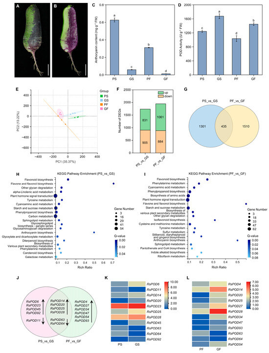 Transcriptome analysis of the chimeric-colored radish. (A,B) Phenotype of the chimeric-colored radish taproot. Scale bar = 5 cm. (C,D) The anthocyanin content and POD activity in four different tissues. Data are presented as a mean ± SD (n = 3). Different letters indicate statistically significant differences (one-way ANOVA followed by post hoc Tukey test; p < 0.05). PS, purple skin; GS, green skin; PF, purple flesh; GF, green flesh. (E) PCA of all genes identified from the PS, GS, PF, and GF. (F) The number of DEGs in the PS vs. GS and the PF vs. GF. (G) Venn diagrams of the DEGs of cross-comparisons between the PS vs. GS and the PF vs. GF. (H,I) KEGG enrichment analysis of the DEGs in the PS vs. GS and the PF vs. GF comparison, respectively. (J) Venn diagram of differentially expressed RsPODs found in the different tissues. (K,L) Heatmap shows the expression of differentially expressed RsPODs in skin and flesh, respectively. The expression levels are calculated by log2 (FPKM + 1) values.