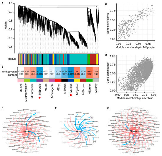 Co-expression network analysis of the RsPODs and the related genes based on the RNA-seq data. (A) Hierarchical cluster tree revealing gene co-expression modules identified by the WGCNA. The branches contain 13 modules labeled in different colors. (B) Module-trait associations. The correlation between the two is shown in the cell by the Spearman correlation coefficient, and the p-value is in parentheses. Cell color ranges from red (high positive correlation) to blue (high negative correlation). The red circles indicate that these module have a significant negative correlation with the anthocyanin content. (C,D) Correlation analysis between module membership (MM) and gene significance for genes in the MEpurple and MEblue, respectively. For each grey (unsorted) gene point, absolute values were computed for both MM and gene significance. (E–G) Co-expression network of RsPOD14 and RsPOD28 in MEpurple, as well as RsPOD54 in MEblue, respectively. Transcription factors are encircled within gray circles, with red lines indicating positive correlations and blue lines indicating negative correlations.