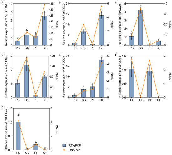 To verify the reliability of the transcriptome data, seven RsPOD genes were selected to assess their expression levels by RT-qPCR. These genes included RsPOD14, RsPOD20, RsPOD25, RsPOD28, RsPOD63, and RsPOD64, which were identified as common DEGs in both the PS vs. GS and the PF vs. GF comparisons, as well as RsPOD14, RsPOD28, and RsPOD54, which were selected based on WGCNA. The RT-qPCR results showed that the expression patterns of these selected RsPODs were highly consistent with the RNA-seq data, thereby confirming the accuracy and reproducibility of the transcriptomic data (Figure 9). Subsequently, a correlation analysis was performed to investigate the relationship between the expression levels of the selected RsPOD genes and the POD enzyme activity (Table S10). The results showed that the POD enzyme activity was significantly positively correlated with the expression of RsPOD20, RsPOD25, and RsPOD28, whereas it was significantly negatively correlated with the expression of RsPOD63.