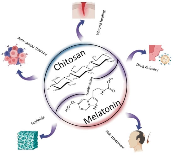 To reduce our environmental impact and dependence on fossil fuels, efforts are increasingly focused on the use of biodegradable materials, particularly those derived from natural sources. Among these, biopolymers stand out for their significant biodegradability and biocompatibility. In recent years, chitosan—a derivative of chitin composed of β-(1,4)-D-glucosamine and β-(1,4)-N-acetyl-D-glucosamine units—has gained considerable popularity [,]. Over the past two decades, chitosan has become a widely used raw material across numerous fields due to its unique properties. Its primary advantages include its proven safety and non-toxicity [], along with its notable antioxidant and antimicrobial activities. Additionally, chitosan exhibits excellent moisturizing and adsorption capabilities, and its functional groups allow for versatile chemical modifications []. However, its application is somewhat limited by its poor solubility in neutral and basic solutions []. Chitosan is primarily characterized by two key parameters: molecular weight and degree of deacetylation. The latter should be at least 60% for chitosan to exhibit desirable properties. These parameters significantly influence the physicochemical characteristics of the biopolymer, including its viscosity and solubility—factors that are crucial for its bioactivity, antibacterial and antioxidant properties, biodegradability, toxicity, and biocompatibility [,,]. Low-molecular-weight chitosan typically exhibits better solubility and lower viscosity compared to its high-molecular-weight counterpart. Additionally, it can form denser structures, which may enhance the mechanical properties of materials. According to the literature, low-molecular-weight chitosan also demonstrates improved biodegradability and biocompatibility, lower toxicity, and greater bioactivity than chitosan with a higher molecular weight. Its antioxidant and antimicrobial activities are likewise more pronounced. Therefore, both molecular weight and degree of deacetylation should be carefully considered when designing chitosan-based materials for specific applications [,,]. This biopolymer is widely used across various fields, including medical sciences, pharmacy, cosmetology, and the food and food packaging industries, as well as environmental pollution control [,]. It has been approved as a safe substance for use in food and medicine by the United States Food and Drug Administration (US FDA) []. Chitosan is particularly valuable as a drug delivery system due to its mucoadhesive properties and enhanced absorption, which stem from its polycationic nature. These characteristics make chitosan an effective matrix for drug encapsulation and delivery []. As a carrier, chitosan protects active substances, such as drugs, from oxidation and other environmental factors. For substances sensitive to external conditions, a protective delivery system is essential. Moreover, chitosan-based carriers enable the controlled release of active compounds, a feature that is highly important in many medical treatments. Chitosan is increasingly used in combination with melatonin (N-acetyl-5-methoxytryptamine), an indoleamine neurohormone synthesized predominantly in the pineal gland. Melatonin plays a key role in regulating circadian rhythms and a wide range of physiological functions []. Its secretion peaks at night but naturally declines with age, a change associated with neurodegenerative processes []. Beyond the pineal gland, melatonin is also synthesized in peripheral organs as a protective response against endogenous and exogenous stressors [,]. It regulates numerous physiological processes [] and is found not only in animals but also in plants, bacteria, fungi, and other unicellular organisms [,], as well as in several natural products, including honey []. Melatonin participates in various cellular processes, exhibiting antioxidant, anti-apoptotic, and anti-inflammatory activities. It also regulates immune responses, mitochondrial homeostasis, and pigmentation []. Thanks to its amphiphilic nature, melatonin can act in both lipid and aqueous environments within cells, effectively reducing oxidative stress. It influences glutathione synthesis and the activity of glutathione reductase. Moreover, melatonin has demonstrated potential in anti-cancer strategies [], and as a promising agent in anti-aging skincare, particularly in mitigating the harmful effects of UV radiation [,,]. However, melatonin has a short half-life and low bioavailability, which limits its therapeutic effectiveness. Encapsulation using biopolymeric carriers such as chitosan offers a promising solution to these limitations []. In most applications, chitosan functions as a carrier that protects melatonin until it reaches its target site. Due to its broad biological activity, melatonin is used far beyond sleep regulation, with applications spanning medicine, the food industry, and more. This review compiles and summarizes the scientific findings on the combined use of chitosan and melatonin, focusing on their applications in wound healing, cancer therapy, tissue engineering, drug delivery, and food chemistry, with additional insight into potential uses in cosmetology, veterinary medicine, and agriculture (Figure 1).