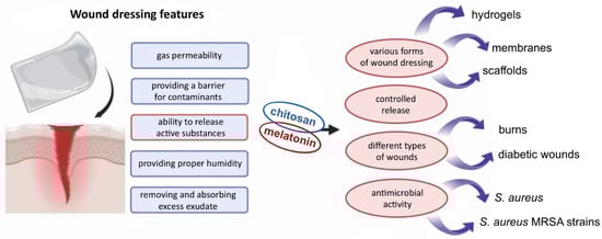 In addition to their proven efficacy in wound healing, systems combining chitosan and melatonin offer another significant advantage: the protection of melatonin during storage prior to application. Hafner et al. [] investigated the stability of lecithin/chitosan nanoparticles loaded with melatonin following a freeze-drying process. The study evaluated the effects of different types of lecithin and various cryoprotectants, including glucose and trehalose. The results demonstrated that trehalose was the more effective cryoprotectant, enabling the storage of melatonin-loaded chitosan-based nanoparticles for up to seven months at 4 °C without significant changes in appearance, physicochemical properties, or melatonin content []. Melatonin release behavior is a critical factor in many biomedical applications. Pancescu et al. [] conducted a detailed analysis of melatonin release through chitosan/sEPDM (sulfonated ethylene/propylene/diene terpolymer) composite membranes under various conditions. Compared to pure sEPDM membranes, the composite membranes exhibited a faster melatonin release rate. The authors suggested that this system may be particularly suitable for sports-related applications, where rapid drug action is essential []. Beyond wound dressings, the combination of chitosan and melatonin is showing increasing promise in biomedical engineering, particularly in the development of scaffolds for tissue regeneration and repair.