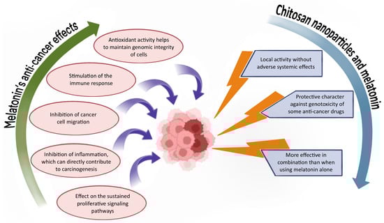 Cancer remains one of the most prevalent diseases worldwide, resulting from uncontrolled cellular proliferation [,]. A variety of treatment modalities are currently employed, including chemotherapy, radiation therapy, immunotherapy, targeted therapies, and surgical resection [,]. While conventional treatments such as chemotherapy can be effective, cancer-related mortality rates remain high. Major limitations of these therapies include a lack of specificity, poor drug solubility, and significant cytotoxicity to healthy tissues []. Emerging anti-cancer strategies rooted in precision medicine are increasingly based on nanotechnology []. Nanoparticles offer several advantages over traditional therapies, including localized activity that reduces systemic side effects. In addition, they are typically non-toxic, biodegradable, biocompatible, and non-immunogenic, and they can facilitate the delivery of poorly soluble drugs []. Researchers are also actively exploring natural substances as potential anti-cancer agents []. Among these, melatonin has gained significant interest due to its multifaceted biological activity []. Although further studies are needed to fully elucidate its mechanisms of action in cancer treatment [], melatonin is recognized for its anti-cancer potential through various pathways. These include modulation of cell signaling pathways, antioxidant effects, protection of genomic integrity, inhibition of cancer cell migration, and suppression of the inflammatory processes associated with carcinogenesis [,,]. The combination of chitosan nanoparticles and melatonin is gaining increasing attention in cancer research, as illustrated in Figure 3.