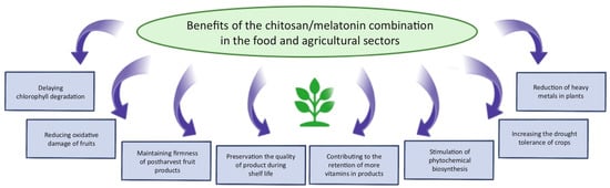 Summary of the benefits of using a chitosan/melatonin combination in the food industry and agriculture.