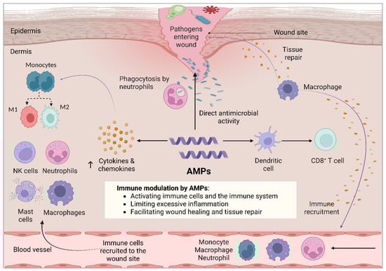 By stimulating angiogenesis, promoting keratinocyte migration, and enhancing fibroblast activity, which are key processes for wound closure and skin restoration, AMPs can directly contribute to tissue remodeling alongside their immunomodulatory roles [,,,,,]. This review examines how AMPs coordinate the transition from inflammation to proliferation during wound healing, emphasizing the molecular interplay between immune regulation and tissue regeneration. Unlike previous studies that often treat these roles separately, we explore how the antimicrobial and immunomodulatory functions of AMPs intersect to drive effective wound resolution. By highlighting this dual functionality, we underscore their therapeutic potential not only as alternatives to conventional antibiotics but also as modulators of the wound microenvironment, offering new directions for treating both acute and chronic wounds.