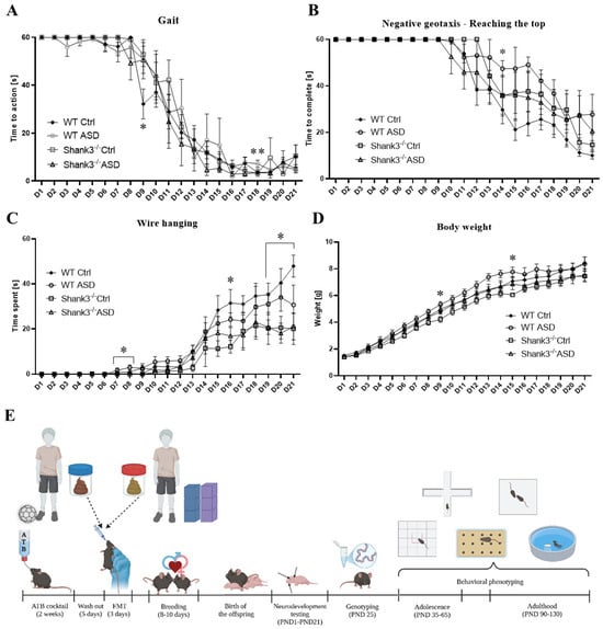 Neurodevelopmental milestones. (A) Gait (* =WT ASD > WT Ctrl; ** = WT ASD > WT Ctrl). (B) Proprioception and vestibular function (* = WT ASD < all). (C) Neuromuscular apparatus using wire hanging (D7-8, * =WT ASD > WT Ctrl; D16, D19-21, * = WT ASD < WT Ctrl). (D) Body weight (D9, D15, * = WT ASD > WT Ctrl). (E) Experimental design. Created by BioRender.com. PND/D—postnatal day, ATB—antibiotic cocktail, FMT—fecal microbiota transplantation, ASD–mice prenatally exposed to FMT from children with ASD, Ctrl—mice prenatally exposed to FMT from neurotypical children, mean ± SEM, * p < 0.05, ** p < 0.01, WT Ctrl, n = 11; WT ASD, n = 5; Shank3 Ctrl, n = 7; and Shank3 ASD, n = 6.