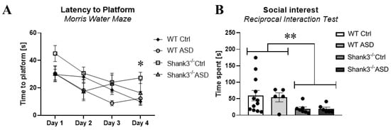 Behavioral testing during adolescence. (A) The training phase of memory and learning testing (* = Shank3−/− ASD < Shank3−/− Ctrl). (B) Social interest in sociability testing (** = Shank3−/− < WT). ASD—mice prenatally exposed to fecal microbiota transplantation (FMT) from children with ASD, Ctrl—mice prenatally exposed to FMT from neurotypical children, mean ± SEM, * p < 0.05, ** p < 0.01, WT Ctrl, n = 11; WT ASD, n = 5; Shank3−/− Ctrl, n = 7; and Shank3 ASD, n = 6.