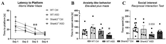 Behavioral testing in adulthood. (A) The training phase of memory and learning testing (D1, D3, * = Shank3−/− ASD > Shank3−/− Ctrl). (B) Anxiety-like behavior as measured in the elevated maze plus shaped test (* = Shank3−/− ASD > Shank3−/− Ctrl). (C) Social interest in sociability testing. ASD—mice prenatally exposed to fecal microbiota transplantation (FMT) from children with ASD, Ctrl—mice prenatally exposed to FMT from neurotypical children. D = postnatal day, mean ± SEM, * p < 0.05, ** p < 0.01, WT Ctrl, n = 11; WT ASD, n = 5; Shank3−/− Ctrl, n = 7; and Shank3 ASD, n = 6.