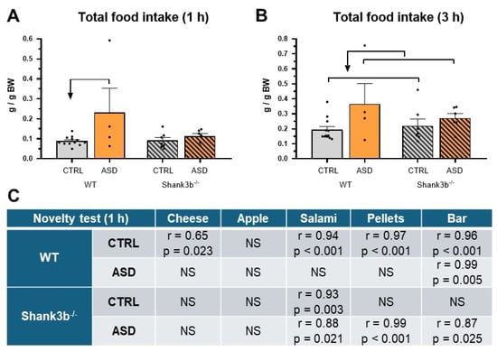 Total food intake after 1 h (A) and after 3 h (B) during the Novelty test and correlation between the intake (g) and preference (%) of all individual tested compounds during the first hour (C) in the overnight fasted Shank3b genotype mice prenatally exposed to gut microbiota from children with neurotypical development (CTRL, n = 19) and children with autism spectrum disorder (ASD, n = 10), respectively, mean ± SEM. The arrow indicates a statistically significant difference from the respective group (p < 0.05). r 0.36 to 0.67 indicates a moderate correlation, r = 0.68 to 0.89 a strong correlation, and r > 0.90 a very strong correlation. NS—not significant.