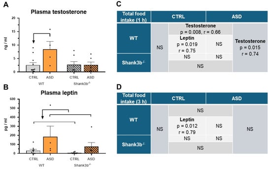 Plasma testosterone concentrations (A), plasma leptin concentrations (B) and correlation analysis between the plasma testosterone and plasma leptin concentrations with total food intake during the first hour (C) and during the 3 h period (D) in the Novelty test in the overnight fasted male Shank3b genotype mice prenatally exposed to gut microbiota from children with neurotypical development (CTRL) and from children with autism spectrum disorder (ASD), mean ± SEM. The arrow indicates a statistically significant difference from the respective group (p < 0.05). r = 0.36 to 0.67 indicates a moderate correlation, r = 0.68 to 0.89 a strong correlation, and r > 0.90 a very strong correlation. NS—not significant.