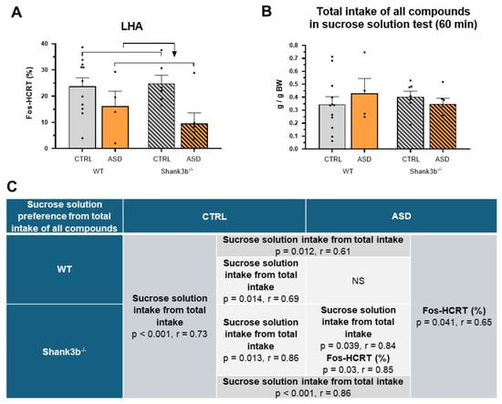 The percentage of Fos-HCRT immunopositive neurons in the lateral hypothalamic area (LHA) (A), total intake of all compounds (B), and correlation analysis between the individual sucrose solution preference and its intake from total intake of all compounds as well as between the individual sucrose solution preferences from total intake of all compounds and percentage of Fos-HCRT neurons in LHA (C) during the 60 min-lasting sweet solution test in the overnight fasted male Shank3b genotype mice prenatally exposed to gut microbiota from neurotypical control children (CTRL) and from children with autism spectrum disorder (ASD), mean ± SEM. The arrow indicates a statistically significant difference from the respective group (p < 0.05). r 0.36 to 0.67 indicates a moderate correlation, r 0.68 to 0.89 a strong correlation, and r > 0.90 a very strong correlation. NS—not significant.