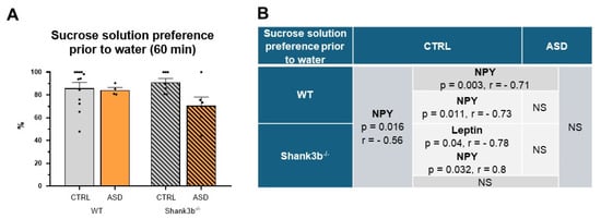 Sucrose solution preference prior to water (A) and its correlation analysis between plasma testosterone, leptin, and NPY level (B) during the 60 min-lasting sweet solution test in overnight fasted male Shank3b genotype mice prenatally exposed to gut microbiota from children with neurotypical development (CTRL) and from children with autism spectrum disorder (ASD), mean ± SEM. The arrow indicates a statistically significant difference from the respective group (p < 0.05). r = 0.36 to 0.67 indicates a moderate correlation, r = 0.68 to 0.89 is a strong correlation, and r > 0.90 a very strong correlation. NS—not significant.