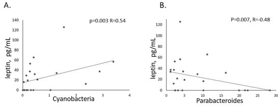 The correlation of relative abundance of (A). Cyanobacteria and (B). Parabacteroides with leptin plasma concentrations in offspring of animals exposed to fecal microbial transplantation.