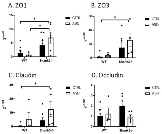 Analyzing the prenatal impact of FMT on the intestines of Shank3b mice, we found that three out of four gut permeability markers, zonula occludens ZO1, ZO3, and claudin, were significantly higher in the colon of Shank3b−/− offspring animals exposed to transfer of microbiota from children with ASD compared to WT mice prenatally exposed to the control microbiota (Figure 9). Also, ZO1 demonstrated increased intestinal permeability in Shank3b−/− versus WT animals in the group exposed to FMT ASD (Figure 9A). A similar trend was found in ZO3, but it did not reach statistical significance. These preliminary results suggest that the combinatory effect of genetic factors in tandem with prenatal administration of FMT from ASD children has a significant impact on intestinal permeability, while the genetic factor itself is important only against the ASD microbiota background.