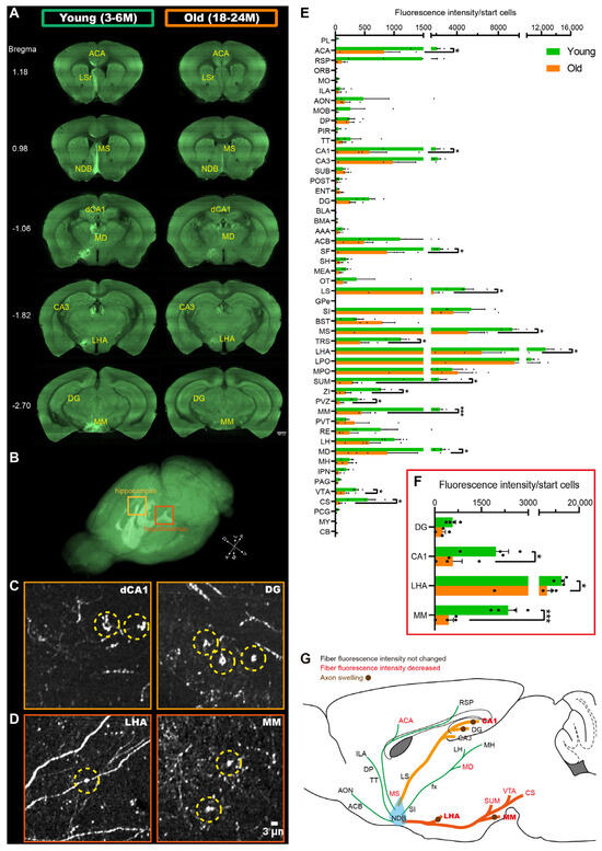 The aging degeneration of the whole-brain projections of BF-PV neurons. (A) The fluorescent image of BF-PV projections in the main targeting regions of the young group (3–6 months) and the old group (18–24 months), respectively. Scale bar: 200 μm. (B) With fMOST, the maximum intensity projection map of the fluorescence in the entire brain showed the axonal fiber distribution pattern of BF-PV neurons. (C) Axonal swelling was observed in the hippocampal subregions in the old group. Scale bar: 3 μm. (D) Axonal swelling in the hypothalamus. Scale bar: 3 μm. (E) The fiber fluorescence intensity of BF-PV neurons in multiple downstream target areas (from 4 mice in each group). (F) The changes in fiber fluorescence intensity in brain regions with axonal swelling. * p < 0.05, *** p < 0.001. (G) The degeneration degree of different BF-PV neuron circuits. Terms in black represent downstream target areas with no change in fiber fluorescence intensity. Pathways in green represent circuits that have not changed significantly. Terms in red represent downstream target areas with significantly reduced fiber fluorescence intensity. Brown circles represent axonal swelling. Pathways in yellow and orange represent circuits with severe degeneration.