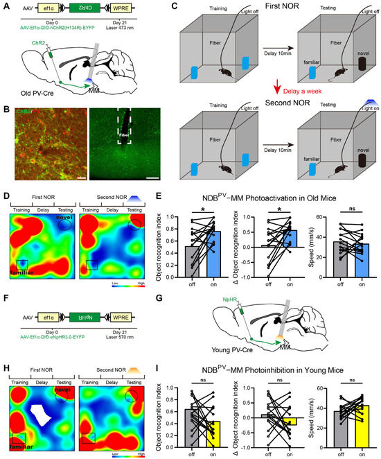 Roles of the MM in the cognitive function of BF-PV neurons. (A) Virus expression vector and schematic diagram of surgery used in the old group. (B) Virus injection sites and fiber embedding sites. Scale bar: 30 μm, 200 μm. (C) Operation procedures of optogenetic activation of the old group. (D) Time heatmaps of NOR in the old group. (E) In the old group, the effects of BFPV-MM activation on the recognition index of a novel object, index change rate, and movement speed (n = 15). (F) Virus expression vector and schematic diagram of surgery used in the young group. (G) Operation procedures of optogenetic inhibition of second NOR test in the young group. (H) Time heatmaps of NOR in the young group. (I) In the young group, the effects of BFPV-MM inhibition on the recognition index of novel object, index change rate, and movement speed (n = 15). * p < 0.05, ns represents no statistical difference.