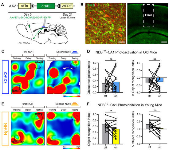 Roles of CA1 in the cognitive function of BF-PV neurons. (A) Virus expression vector and schematic diagram of surgery used in the old group. (B) Virus injection sites and fiber embedding sites. Scale bar: 30 μm, 200 μm. (C) Time heatmaps of NOR in the old group. (D) In the old group, the effects of BFPV-CA1 activation on the recognition index of novel object and index change rate (n = 15). (E) Time heatmaps of NOR in the young group. (F) In the young group, the effects of BFPV-CA1 inhibition on the recognition index of novel object and index change rate (n = 15). ns represents no statistical difference.