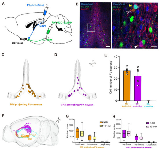 The morphology of BF-PV neurons projecting to MM and CA1. (A) The labeling diagram for MM- and CA1-projecting PV neurons with Fluoro-Gold and RV, respectively. (B) Distribution of neuron soma in the BF that project to MM (green), CA1 (blue), and PV positive (red). The white hollow arrow represents the MM-projecting PV neurons, and the orange one shows the overlap signals. The white arrow represents the CA1-projecting PV neurons, and the signals overlap and appear purple. The yellow arrow is the co-projecting PV neuron, and the signals overlap and appear cyan. Scale bar: 100 μm, 20 μm. (C,D) The soma location of MM- and CA1-projecting PV neurons. (E) The number of MM- and CA1-projecting PV neurons were counted (n = 4). (F) Single-neuron morphological reconstruction of MM- and CA1-projecting PV neurons, with the blue color denoting the co-projecting neuron. (G) Quantitative analysis of aging characteristics of MM- and CA1-projecting PV neurons: 3–6 M (n = 5); 10–14 M (n = 16). (H) Quantitative analysis of aging characteristics of PV neurons projected from the BF to MM: 3–6 M (n = 15); 10–14 M (n = 14).