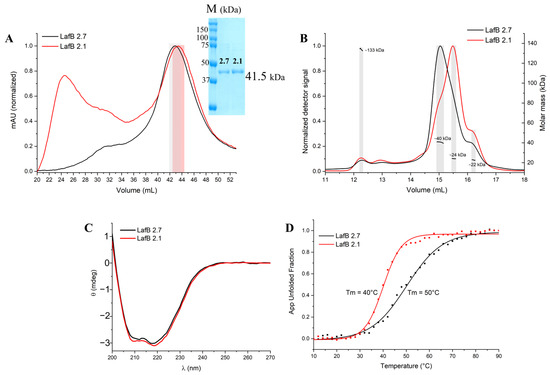 This profile may reflect EfLafB2.1 instability under high-concentration conditions (2 mg·mL−1), in contrast to the structural integrity observed at lower concentrations in subsequent CD experiments (0.25 mg·mL−1). Moreover, we hypothesized that the observed presence of proteins with lower molecular masses in the SEC-MALS analysis of EfLabB2.1 could be attributed to either spontaneous degradation during concentration or aggregation, which may have led to an increased concentration and thus detection of minor contaminants.