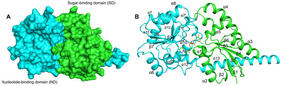 The predicted structure of EfLafB showed a high degree of reliability according to the pLDDT (>90) values and the PAE score (<10) (Figure S3). The EfLafB structure presents the classic GTB fold with a sugar-binding domain (SD, green) and a nucleotide-binding domain (ND, cyan) (Figure 2). Both the SD and the ND domains feature a βαβ Rossmann fold type [26,27], consisting of six β-strands and six α-helices. Molecular docking revealed the binding of UDP-Gal between the ND and SD domains with an affinity of −8.2 kcal/mol, indicating a suitable binding interaction. This substrate-binding site has been observed in other crystallographic glycosyltransferases in complex with their ligands [28,29,30].