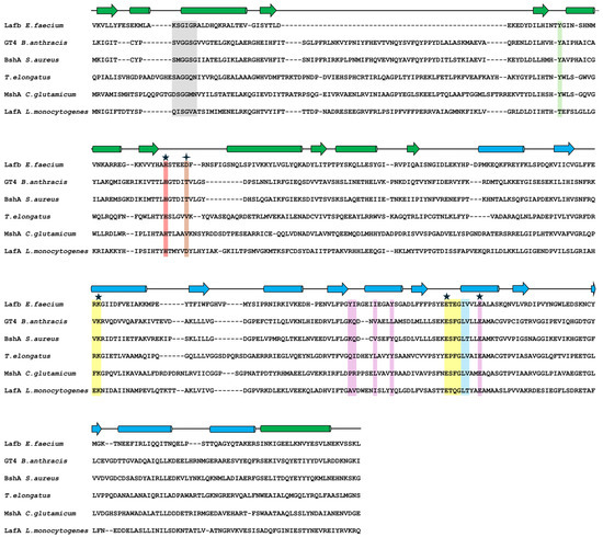 Multiple sequence alignment (MSA) based on the protein structure of EfLafB and prokaryotic glycosyltransferases with experimentally determined structures (PDB codes: 2JJM, 6N1X, 3C4Q, and 6KIH) [28,29,30,31] validated the interactions between specific residues of EfLafB and the substrate UDP-Gal suggested by molecular docking (Figure 3).