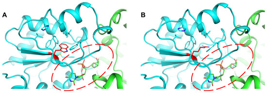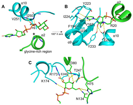 Conserved interaction regions and substrate specificity-related residues were identified (Figure 3 and Figure 4). The glycine-rich region (gray box in Figure 3) that interacts with nucleotide phosphates showed substitutions at positions K15 and R20, potentially increasing the positive charge of the N-terminal end of the α2 helix (Figure 4A). Furthermore, the main chain atoms of the I250 and V251 residues at the N-terminal end of the α10 helix appeared to form hydrogen bonds with the beta phosphate (PB). The β9-α9 loop, α9 helix, and α10 helix residues were found to interact with uridine through hydrogen bonds and hydrophobic interactions (Figure 4B). Among these, E254 on the α10 helix is a highly conserved residue in glycosyltransferases that binds UDP (Figure 3, violet box with star) [32]. The galactose moiety of UDP-Gal appeared to form hydrogen bonds with the side chains of R173 and K174 at the N-terminal end of the α7′ helix (Figure 4C). The R/K pair is thought to stabilize the negative charge of the phosphate groups after the sugar moiety leaves UDP-Gal, functioning similarly to the divalent cations present in GT-A glycosyltransferases [23].