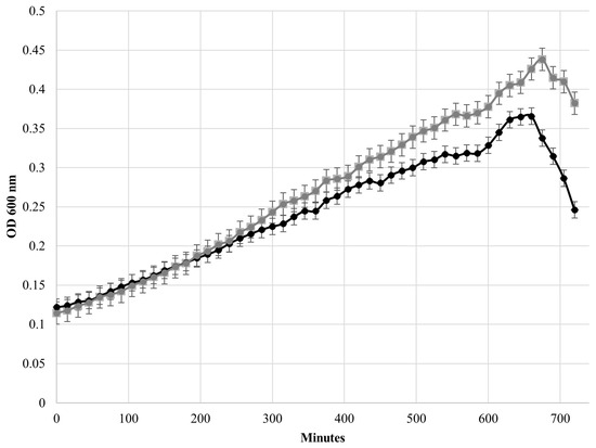 Comparison of the growth curves of the E. faecium HBSJRP18_2.7 (gray) and HBSJRP18 (black) strains.