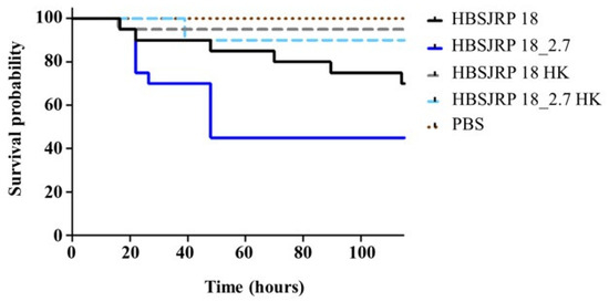 Kaplan–Meier plots of larvae infected with E. faecium HBSJRP18 (lafB mutation) and HBSJRP18_2.7 (lafB restored). The plots shown combine data from three independent experiments. HBSJRP18_2.7 exhibited significantly greater virulence than HBSJRP18, as determined by the Mantel–Cox log-rank test (p = 0.0439). HK: heat-killed.