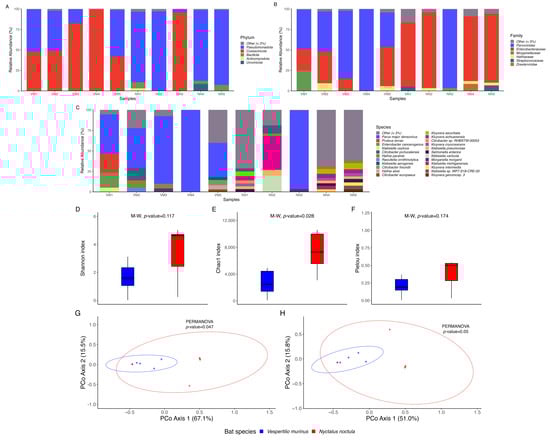 Alpha diversity analysis did not reveal relevant differences between the two bat species (V. murinus and N. noctula). The Shannon (p = 0.117) (Figure 1D) and Pielou (p = 0.174) (Figure 1E) indices indicated no substantial variation in overall diversity and evenness, while Chao1 (p = 0.028) (Figure 1D) suggested a difference in species richness. Beta diversity analysis showed a weak but statistically significant effect. PERMANOVA results for Bray–Curtis (p = 0.047) (Figure 1E) and Jaccard (p = 0.05) (Figure 1F) distances suggested some level of community structure differentiation.