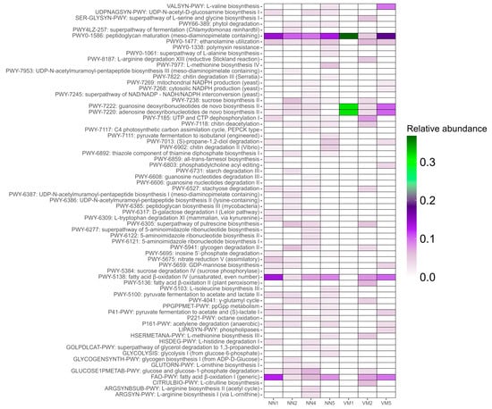 Functional potential of bat gut microbiota based on metabolic pathway abundance. Heatmap of relative abundances of metabolic pathways predicted by HUMAnN3. Rows are individual pathways predicted by HUMAnN3; columns are samples (NN1–NN5 = Nyctalus noctula, VM1–VM5 = Vespertilio murinus). Color intensity represents normalized relative abundance (each column sums to 1).